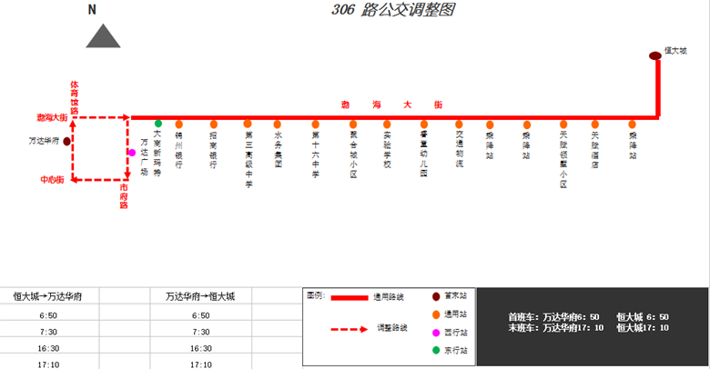 調(diào)整后:“恒大城”—渤海大街—原線—“錦州銀行”—市府路—“萬(wàn)達(dá)廣場(chǎng)”(西行單向站)—中心街—“萬(wàn)達(dá)華府”。